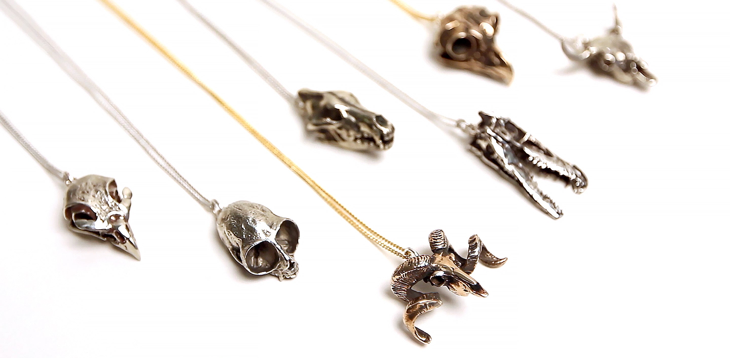 Animal skull jewelry made from 3D scans of REAL skulls, 3D printed tiny, then molded and cast in small batches using traditional lost wax casting.