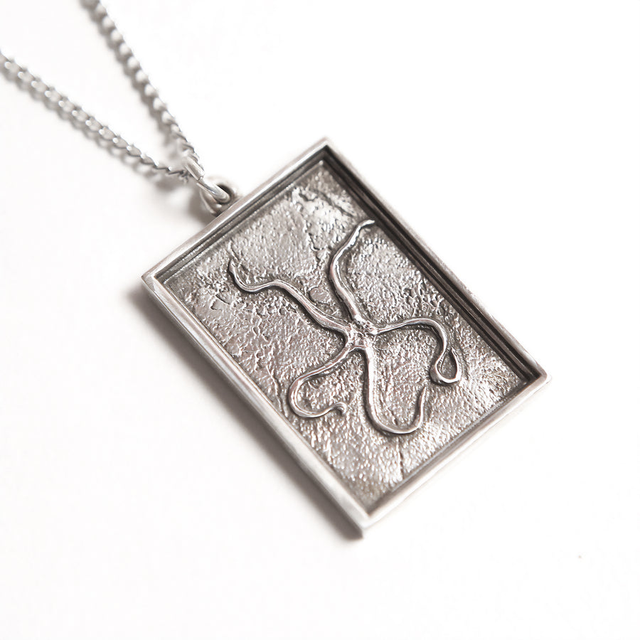 Palaeocoma egertoni - Brittle Stars are related to starfish but, unlike starfish, they can crawl across the sea floor using their flexible arms. This species lived in the Jurassic. Available in White Bronze, Yellow Bronze, and Sterling Silver Includes matching 24 inch chain. Wooden display base optional. Ships worldwide. Dimensions: 23mm x 34mm x 3mm